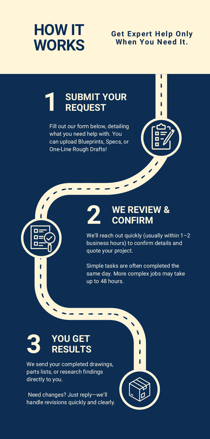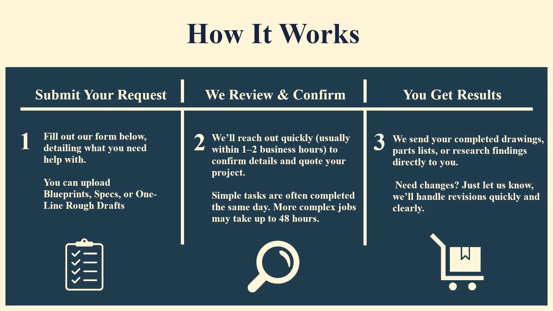 Takeoffs ~ Estimates ~ Bids ~ Finding Parts ~ New Vendors ~ Identification ~ Research ~ Utility Requirements ~ Customized Solutions ~ And More ~